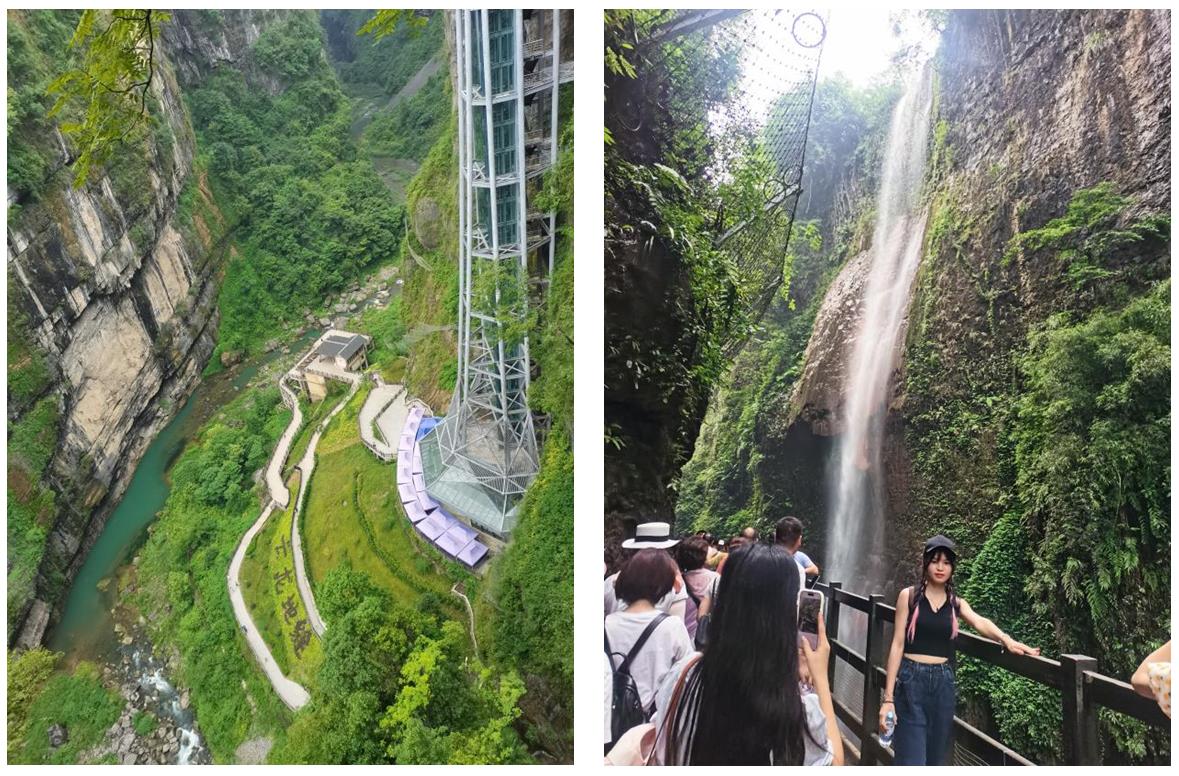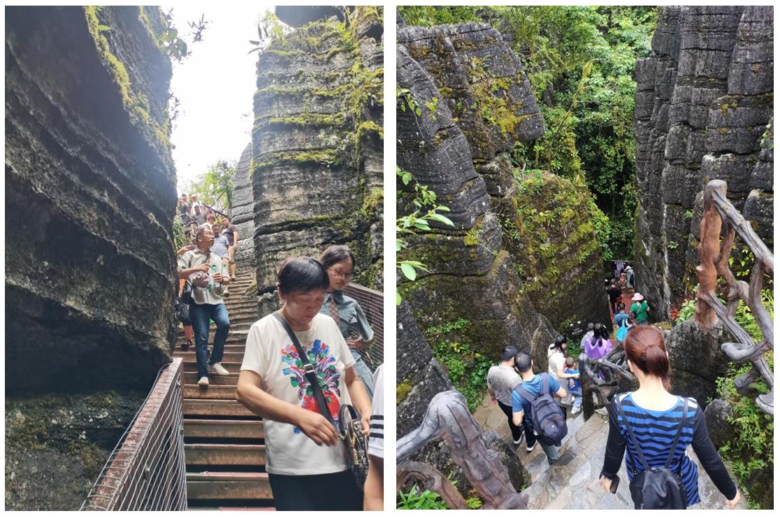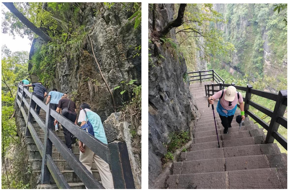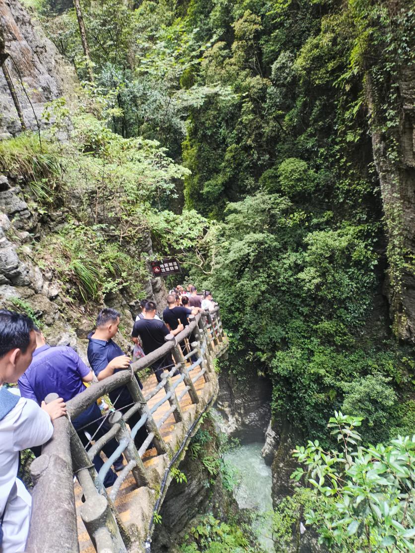 第二天,我們來到國家5A級風景區(qū)——恩施大峽谷,欣賞地球上最美的傷痕——云龍地縫。大家一路斗志昂揚,沿著鑲在懸崖峭壁之上的棧道上下穿行,感嘆大自然的鬼斧神工和生命的渺小與偉大。